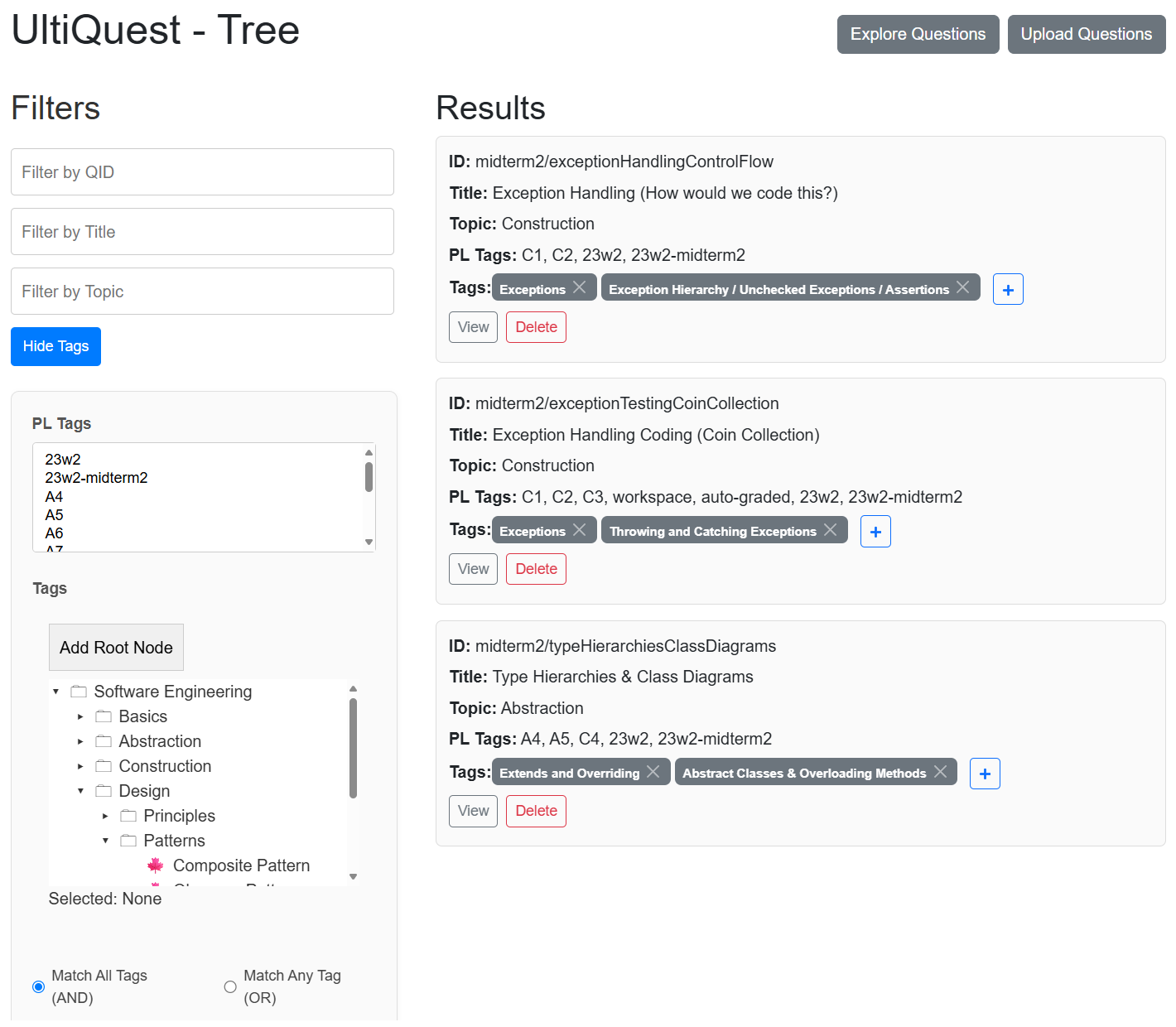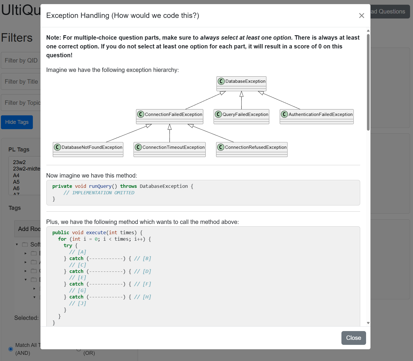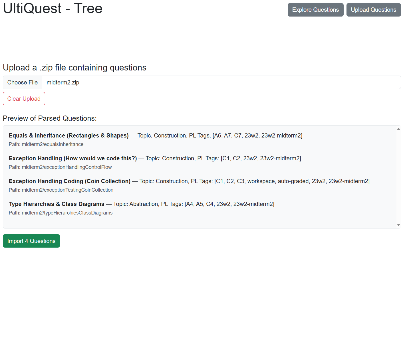 Developed a full-stack educational platform to import, manage, and render PrairieLearn assessment questions. Built with the MERN stack, Ulti-Quest features a hybrid Node.js/Python rendering engine capable of emulating PrairieLearn’s custom HTML elements in a browser. Key functionalities include a zip-file uploader for automated question imports, AI-powered tag generation, and a hierarchical tagging model for intuitive question categorization.